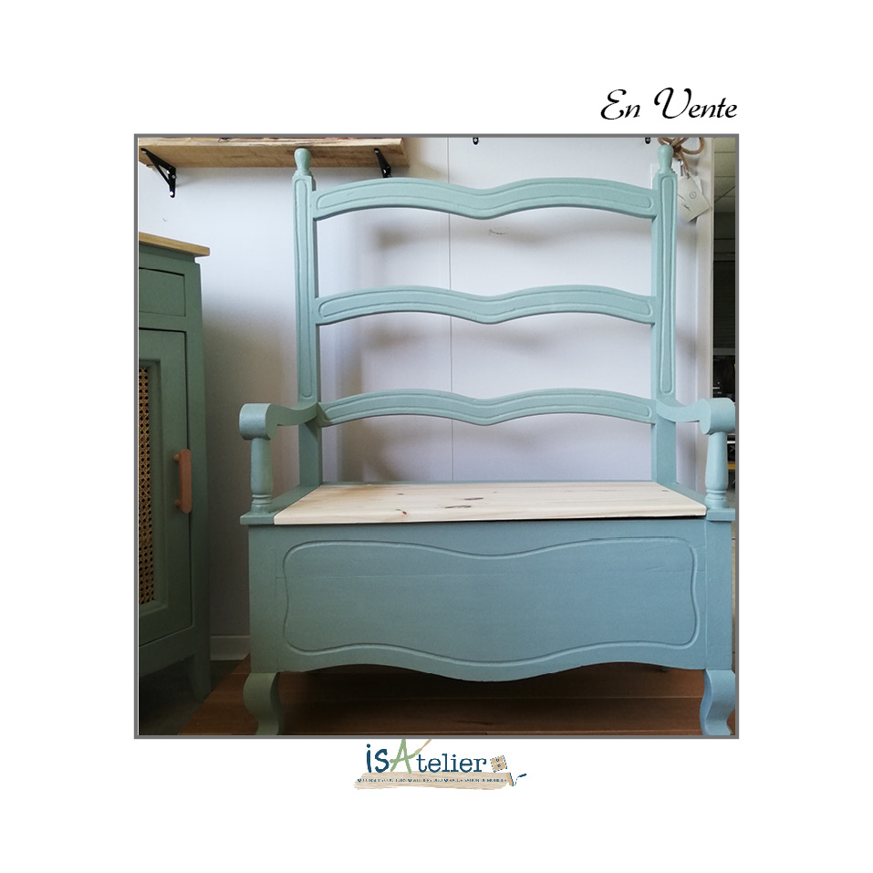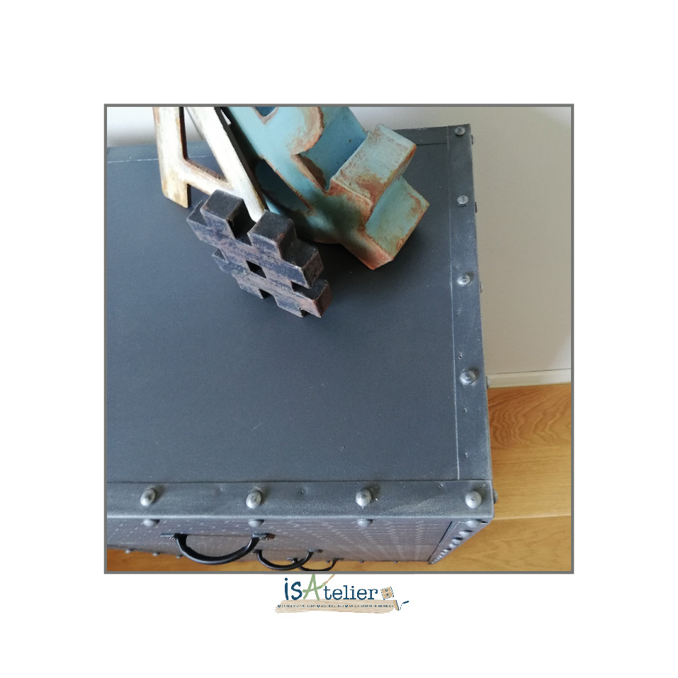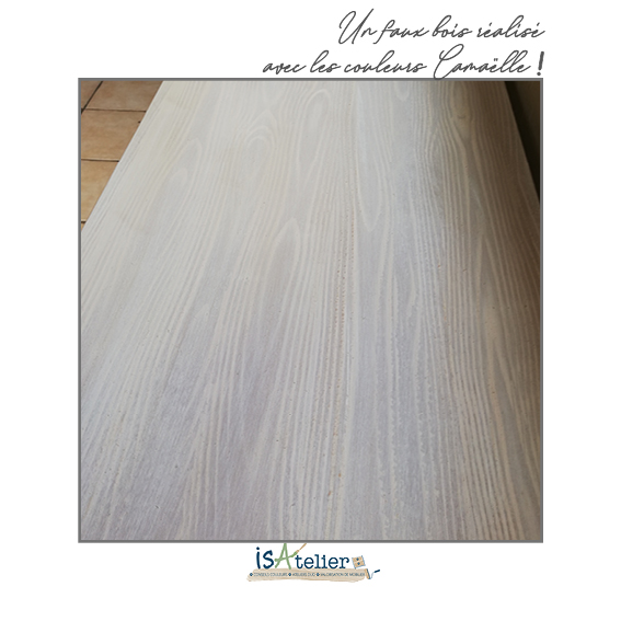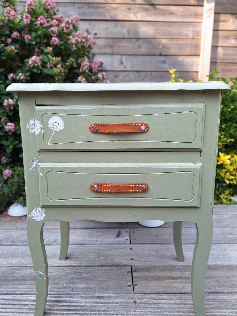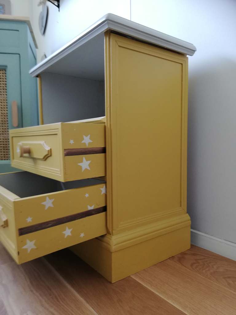 Elle porte les marques du temps, que je n’ai pas cherché à masquer, des fentes, des coups, mais la magie de la peinture a opérée, les couleurs douces et le pochoir romantique « usé » lui donne un charme fou !
