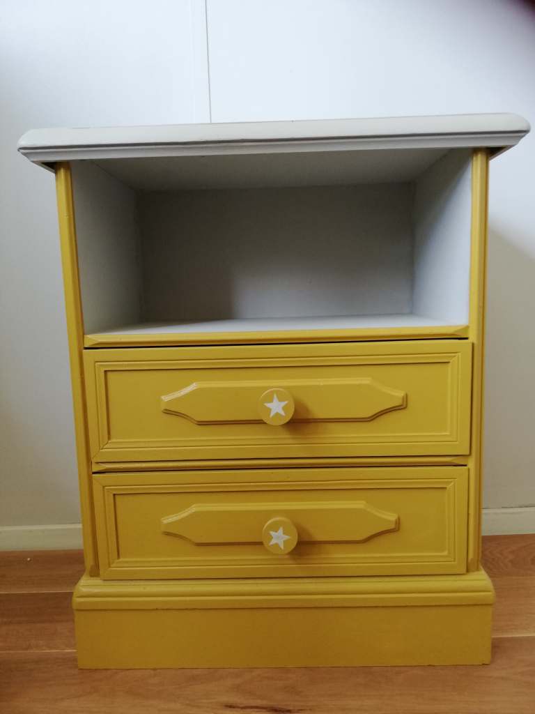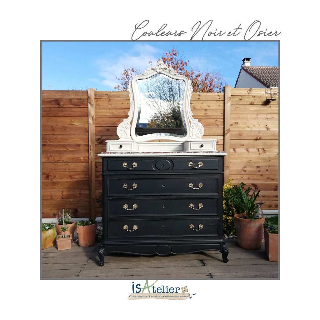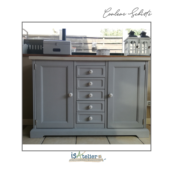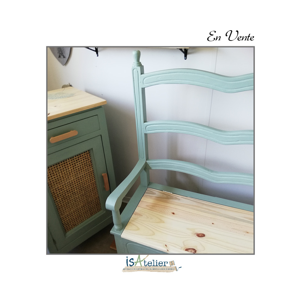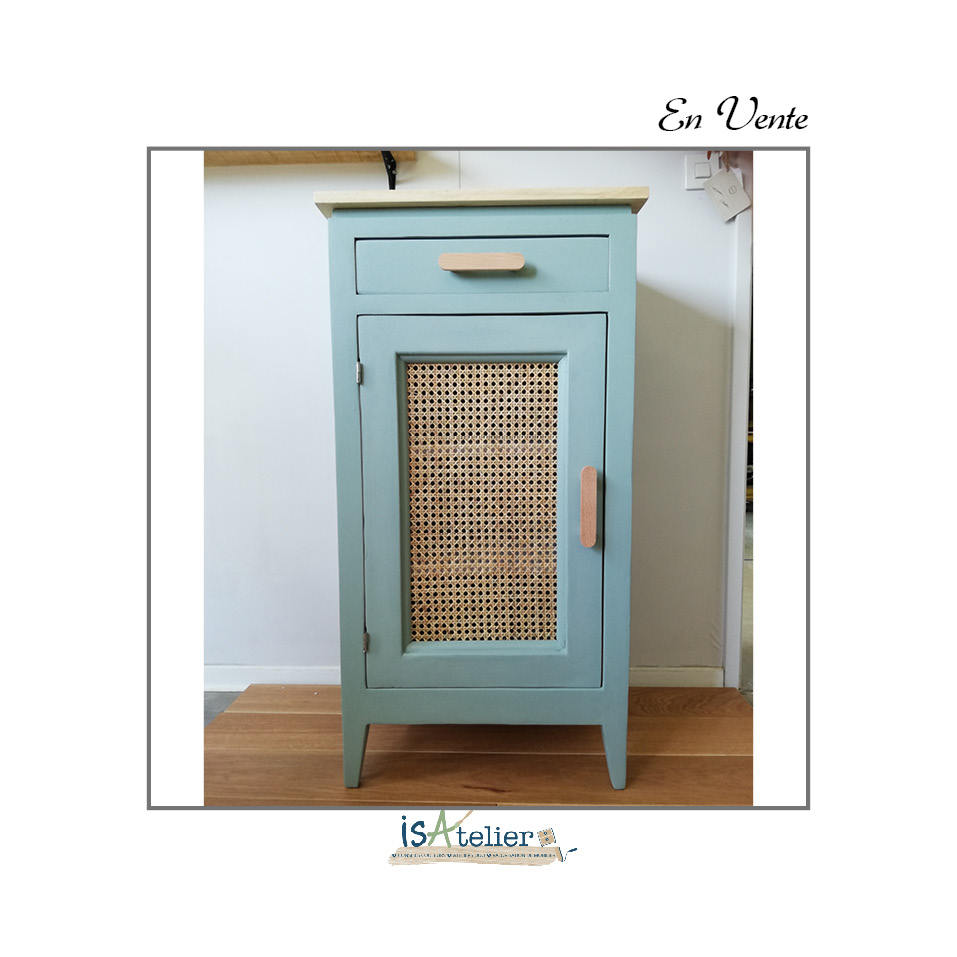 Elle porte les marques du temps, que je n’ai pas cherché à masquer, des fentes, des coups, mais la magie de la peinture a opérée, les couleurs douces et le pochoir romantique « usé » lui donne un charme fou !